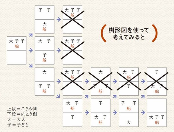 問題:「川岸に父親と2人の子どもがやって来た。向こう側に渡りたいが、あいにく船は一艘しかなく、船頭もいないため、自分たちで漕がなければならない。しかし重量制限があり、1回に乗れるのは父親である大人1人か、あるいは子ども2人まで。さて、どういう順序で船に乗れば全員が向こう岸に渡れるか?」――。