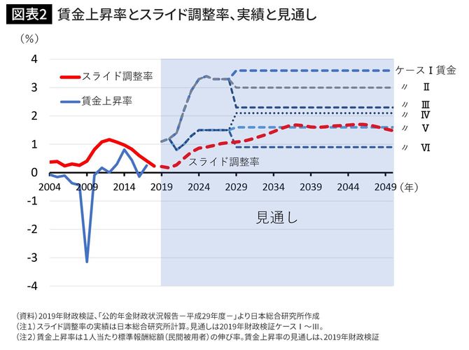 マクロ経済スライドが機能するか否かの鍵を握る賃金上昇率に着目すると、ケースIからVまでの5ケースでは、過去の実績から一転、賃金上昇率が1.6%~3.6%に設定され、概ね1%~1.8%程度のスライド調整率がスムーズに差し引ける、すなわち、マクロ経済スライドが順調に機能していく想定となっている(ちなみに、2028年までとそれ以降とで賃金上昇率が非連続となっているのは、異なるロジックで設定されているためである)。