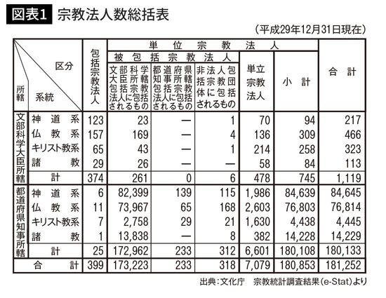 まず、宗教法人の数はどのくらいあるのでしょうか? 早速、文化庁のデータを調べようと思ったら、私の心の動きを察した神様たちのご意向でしょうか、文化庁のサーバーがダウンしていて、出てきませんでした。後日私の真意をご理解いただいたのか、見られるようになりましたので、統計表を示すと、図表1のような数字になっていました。