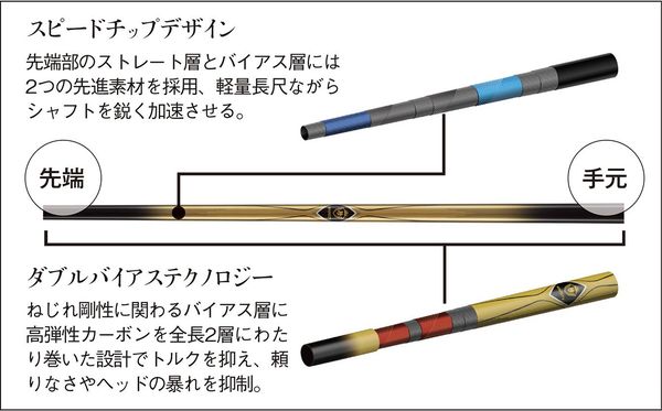 長尺のシャフトの弱点は、重さとねじれ(トルク)。重ければ振り切れず、またねじれが大きければヘッドの動きは安定しない。トルクを抑えるにはシャフトに剛性を持たせなければならないが、剛性を高めれば、それだけ重くなる。この相反する要素を一致させることができれば、安定した球筋で大きな飛距離が得られることになる。