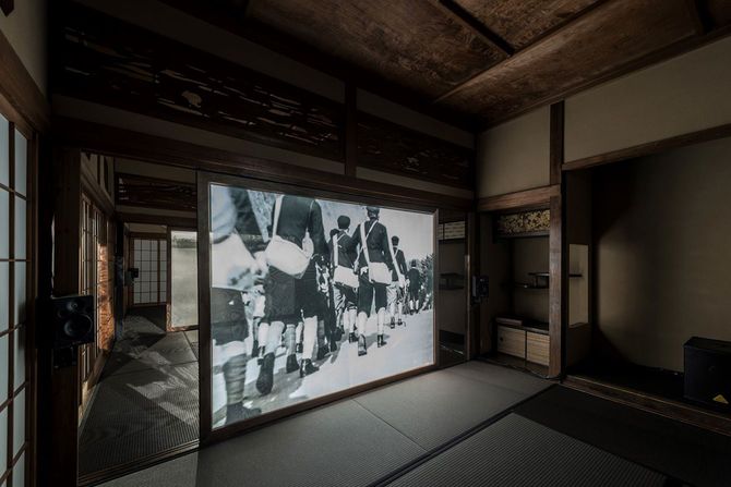 この作品は、日本の軍国主義の拡大を、軍部・哲学者・芸術家など多面的視点から描いた映像作品である。上映会場となった喜楽亭は元料理旅館であり、戦前は軍部関係者が宴席に用いるとともに、特攻に出撃する若い兵士たちが任地へ向かう数日を過ごした場所でもあった。
