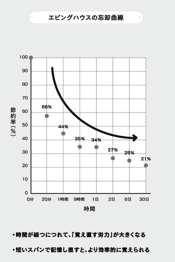 また、このグラフからいえるのは、短いスパンで記憶し直すほど、より効率的に覚えられるということです。つまり、一度覚えたことをそのままにせず、1週間ごととか、1カ月ごととか、定期的に見直すようにすると、記憶に定着させやすくなるのです。