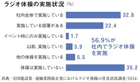 日本人にとっておなじみの「ラジオ体操」。ラジオ体操を取り入れている企業が多数あります。2011年度に財団法人簡易保険加入者協会(現:一般財団法人)が神奈川県立保健福祉大学健康サポート研究会に委託して行った「全国建設業・運輸業関係企業におけるラジオ体操の普及状況調査」によれば、社内全体または一部の部署やイベント時で実施していると回答した企業は実に56.9%に上ります。