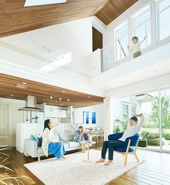 家の中すべてを、「気持ちいい」と感じられる最適な温度と湿度でコントロールするので、開放的な吹き抜けや大空間も快適そのもの。人気の2階リビングなど、住まいづくりの要望を実現できる。加湿機能があるので、乾燥しがちな冬場も、家の中は潤いのある空気で満たされる(※)。