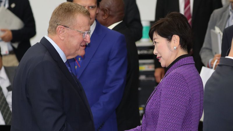 2020年東京五輪のマラソン、競歩の札幌開催案について4者協議に臨む前に、握手する国際オリンピック委員会(IOC)のジョン・コーツ調整委員長(左)と東京都の小池百合子知事=2019年11月1日、東京都中央区
