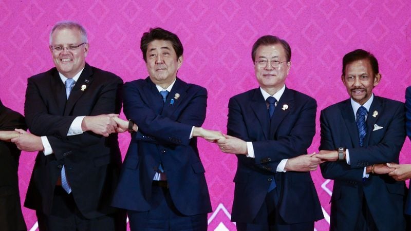 日中韓や東南アジア諸国連合(ASEAN)など16カ国が参加する東アジア地域包括的経済連携(RCEP=アールセップ)首脳会議の記念撮影で並ぶ安倍晋三首相と韓国の文在寅大統領ら。タイ・バンコク近郊で11月4日。