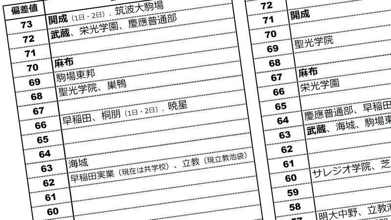 ベスト30のうち男子校は17校で、57%を占めることになる。文部科学省の学校基本調査によると、全国の高等学校における男子校の割合は2%台。最も多くの男子校が集中する東京都でも、私立中学校のうち、男子校の割合は約17%である(平成29年度・東京都私立中学高等学校協会調査による)。