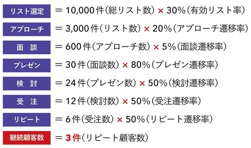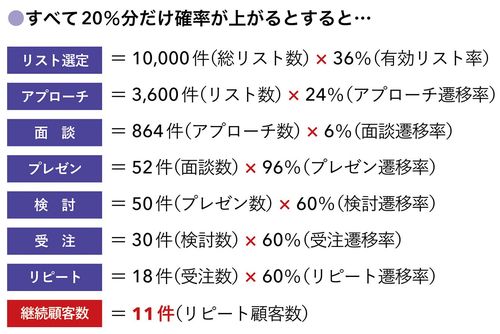 1万件の顧客リストから3件の継続顧客を獲得したことを示す簡単な数式です。では、この数式の右側の有効リスト率および各遷移率がそれぞれ“20%アップ”したらどうなるか。つまり、30%の「有効リスト率」が36%になり、20%の「アプローチ遷移率」が24%になるという具合です。