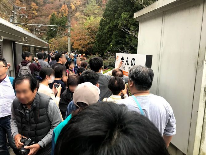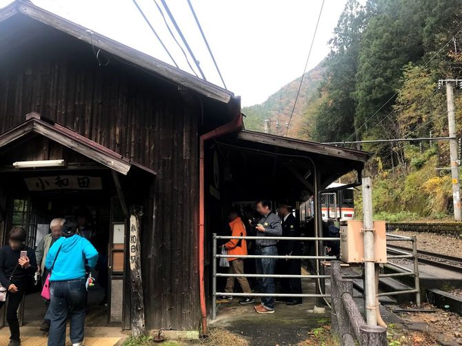 停車する秘境駅は、一つひとつが個性的で、味わい深い。古い木造の立派な駅舎がある小和田、絶壁に細長いホームが張り付く田本、つり橋のかかる天竜川が目の前に広がる為栗など見どころは満載。金野や千代は駅看板に触ると運気がアップすると言われ、停車直後から看板には多くの人だかりができていた。