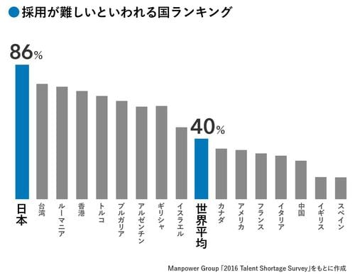 しかしながら今の日本の採用市場をみれば、優秀な人材を引きつけることは簡単ではありません。すでに人口減少の時代に突入した日本において、労働力人口は2010年から2030年の間に700万人以上減ると予測されています。現在、日本は世界一採用が「難しい」国といわれ、当然優秀な人材ほど獲得競争が激化している状況があります。