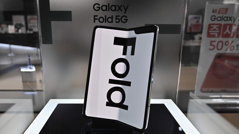 今年10月に発売されたサムスン電子の折りたたみスマートフォン「Galaxy Fold 5G」。閉じた状態は4.6型、開くと7.3型のディスプレイになる。日本では5G非対応の機種が約24万円で販売中。