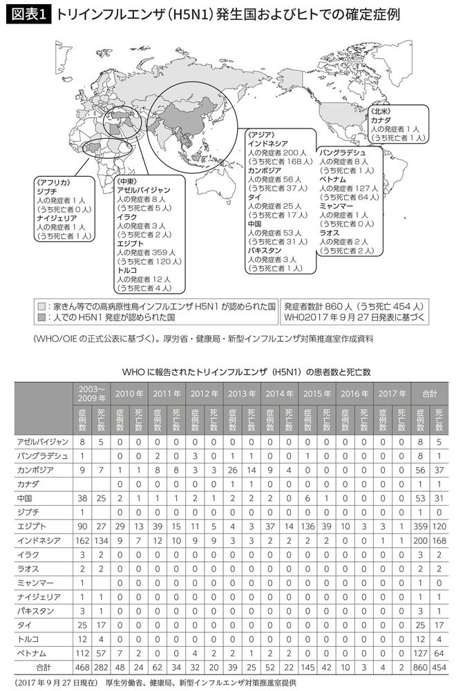わが国では幸い、H5N1型インフルエンザウイルスの犠牲者が出ていませんが、1997年以降、香港を含む中国、ベトナム、タイ、インドネシア、トルコ、イラク、エジプトなどで散発的に患者や死亡者が報告されています(図表参照)。2017年9月までに860人の患者と454人の死亡者が出ています。平均死亡率は50%強という高さです。