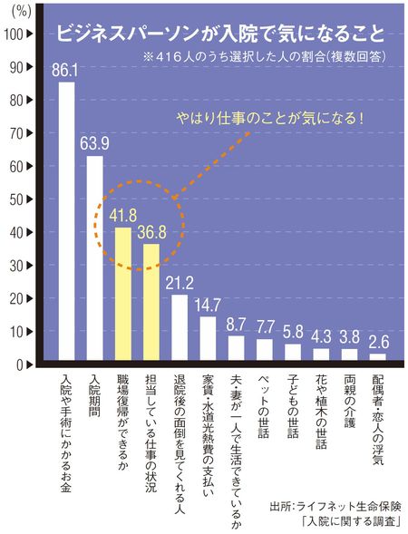 「上司や同僚に気を使わせるのは嫌だし、大きな病気が見つかれば仕事やキャリアにも悪影響を及ぼしかねない」との不安がつきまとう。実際、病気と診断され入院することになったときの心配ごととして、入院や手術の費用、入院期間に続き、職場復帰や担当している仕事の状況など仕事に関する心配が大きな割合を占めている(図参照)。