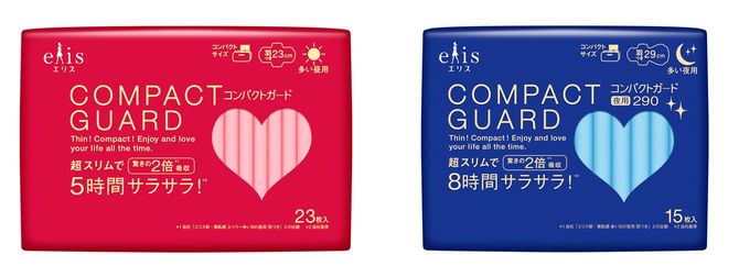 大王製紙が2018年10月に発売を開始した生理用ナプキン「エリス コンパクトガード」シリーズは、デザインが新鮮だ。赤や青の色使いはビビッドで、パステルカラーなどを使った「いかにも生理用品」なデザインとは一線を画す。