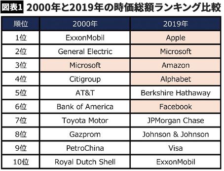 デジタル企業の存在感が増しています。米フォーブス社集計の2000年の米国企業の時価総額ランキングTop10にはデジタル企業はマイクロソフト1社のみだったものの、2019年のランキングでは、アップル、マイクロソフト、アマゾン、アルファベット(グーグル)、フェイスブック、とウェブサービスを祖業とする、いわゆる“ネット系企業”が5社もランクインしています。