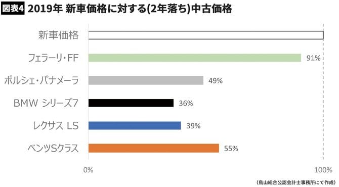 新車価格を100とした場合、2年落ちレクサスの中古価格は39とベンツの55よりも割安で、かつ購入後資産価値を維持できている点もベンツと引けを取りません。むしろ、購入後4年目の価値はベンツよりも大幅に高く維持されていました。さらに、落ち着いたレクサスであれば、外国車よりも事業用資産としてより認められやすいと考えられます。