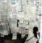 3月14日、宮城県名取市の避難所にて。壁一面に安否をたずねるメモが貼られている。同市は津波で壊滅的な被害を受けた。(PANA=写真)