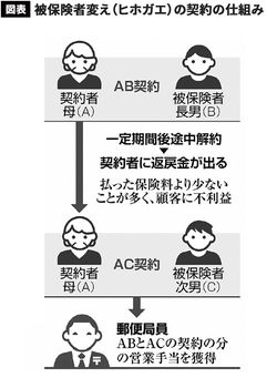 ある郵便局では「AB契約からAC契約に変える」と呼んでいた。高齢の母(A)に養老保険などを契約してもらい、保険をかける相手の被保険者は長男(B)とし、保険料は母が支払う。ここまでは通常の流れだが、局員が新契約を取ろうとして、被保険者を次男(C)とする別契約を母に勧めたとする。保険料の負担が増えるなどの理由で断られた場合、長男の分の保険を解約させて次男が被保険者の新契約を結ばせる。