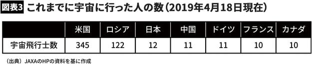 さらに現在までの宇宙飛行士の累計数を各国別にまとめた図表3をご覧いただきたい。宇宙飛行士累積数は宇宙有人活動の蓄積であるため、各国の有人活動能力の指標となる。これを見ると、中国は独自の有人宇宙飛行ロケットを有するとはいえ、米国やロシアとの実績の差は歴然としている。