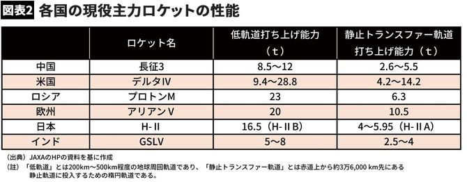 もう一つ別の視点からの数字を示したい。図表2は現時点における主要国の現役主力ロケットの性能比較である。これで見ると、中国の長征3号ロケットは米国、欧州、ロシア、日本の主力ロケットと比較して見劣りがする。