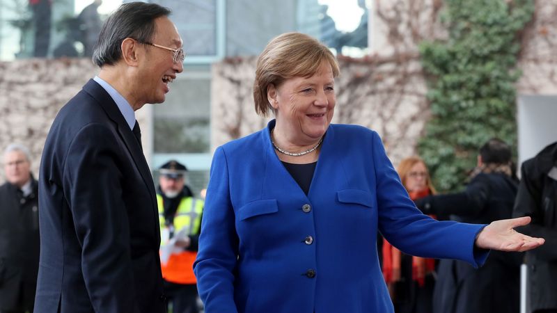 2020年1月19日、ベルリンで開かれたリビア和平会議にて、ドイツのアンゲラ・メルケル首相(右)が中国外相・楊潔篪(よう・けつち、左)を歓迎。ドイツ政府としては、19年4月に内戦の激化したリビアで模索されている国連主導の平和活動に貢献したい。