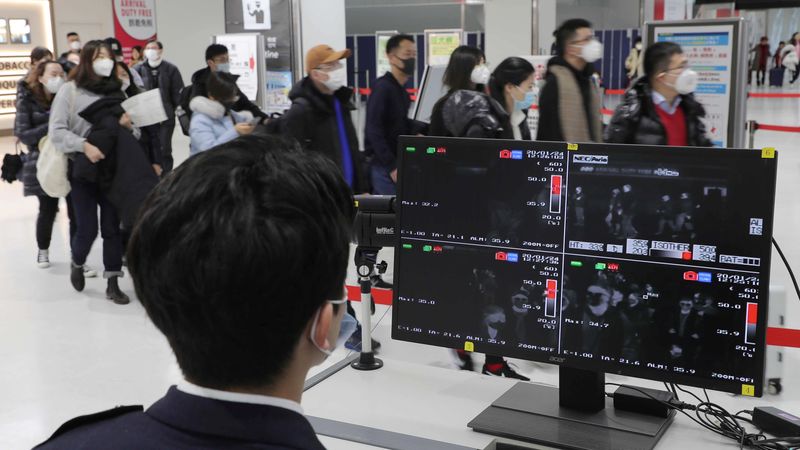 検疫所のサーモグラフィーで、到着した乗客の体温を確認する検疫官=2020年1月24日、千葉・成田空港