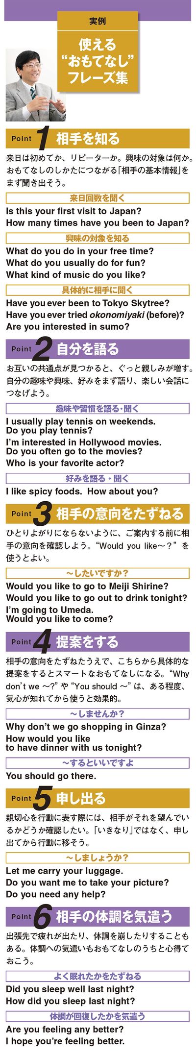 「大きな違いは、おもてなし英語を話すときは、何よりも相手の意向を尊重する姿勢が基本である、という点でしょうね。テクニカルタームの知識や論理性などを駆使し、外国のビジネスパーソンと対等に渡り合える英語力がモノをいうビジネス英語とは、また違ったむずかしさがあります」と、松本 茂先生は語る。例えば、ビジネスランチやディナーに外国の方を招待する場合、日本人はつい、店選びから料理まですべてセッティングしたうえで“おもてなし”するのが礼儀だと考えがちだ。