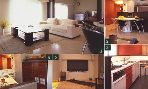 3・4/カウンターで仕切られた対面キッチンは動線を考慮し、リビングに向かって斜めに配置。鮮やかな壁面に合わせて赤を効かせたシステムキッチンが洒落ている。サイズに合わせてすっきり収めた水屋だんすの両脇には、冷蔵庫や家電などを収納。引き戸が効果的な目隠しになっている。