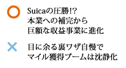 Suicaの強みは鉄道系ならではの使い勝手のよさ。非接触ICカードによる「かざすだけで決済OK」という特徴が、本業のビジネスモデルにフィット、切符を買わずに改札をスルーできる利便性は、他の電子マネーのそれを上回る。また鉄道だけでなく、“駅ソト”で使える提携店舗も増加し、ヤフーやビックカメラなどとの提携カードが続々誕生。携帯で電車に乗れるモバイルSuicaも登場し、東北・東海道新幹線でも利用、割引が適用されるサービスを展開している(JR東海の「エクスプレス・カード」会員になることが条件)。