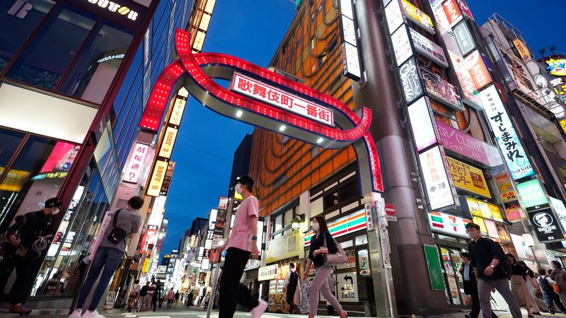 飲食店などが並ぶ東京・歌舞伎町。政府は25日、新型コロナウイルス感染症対策本部を首相官邸で開き、東京、神奈川、埼玉、千葉、北海道の5都道県で続いていた緊急事態宣言について、月末の期限を待たず解除した。=2020年5月25日、東京都新宿区