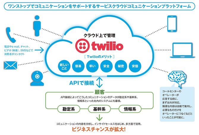 カスタマーエンゲージメントプラットフォームとは、電話やe-mail、チャット、ビデオ(映像)、SMS(ショートメッセージサービス)などの手段で交わした消費者とのコミュニケーションの情報を社内における様々なアプリケーションに取り込み、広範囲に活用するためにクラウド上で構築されている基盤です。たとえば、Twilioは世界180カ国以上の通信会社とパートナーシップを結んでおり、電話番号の情報をダイレクトに取得できるので、日本にいながらにして米国や世界各国のローカル番号で受・発信することが可能です。SMSも同様に可能です。
