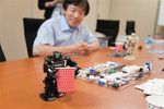 コントローラーの数字とアルファベットを操作して、ロボットに指令を送る。すると、両手でさっと紙コップを抱え上げ、よいしょ、よいしょと運んでいく。滑らかな歩き方とはいえないが、ユーモラスな動きに思わず、にやっとする。