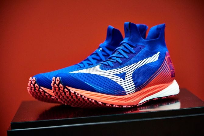 アッパーの設計をハイカットにしたモデルは、ミズノのランニングシューズでは初で、他メーカーを含めても非常に少ない。ニット素材を採用することで、足全体を包み込むようなフィット感があるという。それでいて軽い。