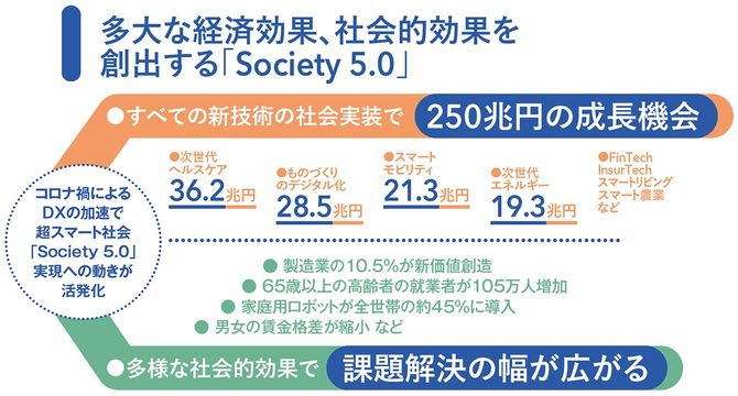 図らずも日本のデジタル革新の遅れを認識することになり、その導入効果の実感もより大きなものとなりました。現在はまさに、日本のDXを推進し、社会課題を柔軟に解決しながら経済を成長させていく「ポストコロナ」に向かう新局面。ここでカギとなるのが経団連が政府と一体となって強力に推進する日本発の未来社会コンセプト「Society 5.0」です。
