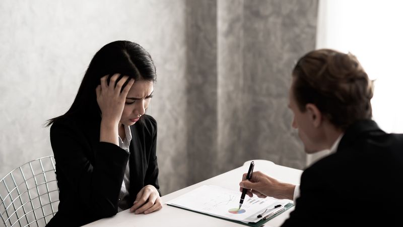 黒いスーツを着た若いビジネスウーマンはストレスを感じている。上司は、暗いトーンでオフィスの仕事の机で苦情を言います。ビジネスストレスと仕事の問題の概念。