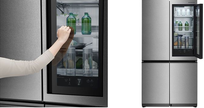 この冷蔵庫でまず印象的なのが、向かって右側上部のドアに配され、製品名にもなっている「InstaView Door-in-Door」だ。窓のようなガラス扉を軽く2回ノックすると、冷蔵庫を開けることなく庫内を確認できる仕組みになっている。ご存じの通り、扉の頻繁な開け閉めは冷気を逃がすことにつながる。その回数を減らすことができれば、無駄なエネルギーを使うことなく、食材の鮮度を保つことが可能だ。さらに、このガラス扉はそれだけを開閉することもできるため、よく出し入れする飲料や調味料などを入れておくのに最適である。