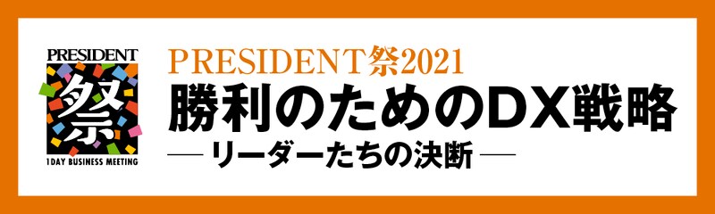2020年11月25日(水)にビジネス誌『PRESIDENT』をリアルに体感できるイベント「PRESIDENT祭2021 勝利のためのDX戦略~リーダーたちの決断~」を開催します。PRESIDENT読者の経営者や管理職などのビジネリーダーたちに向けて、日本を代表するプロフェッショナルたちが「DX戦略」における考え方のヒントを示します。