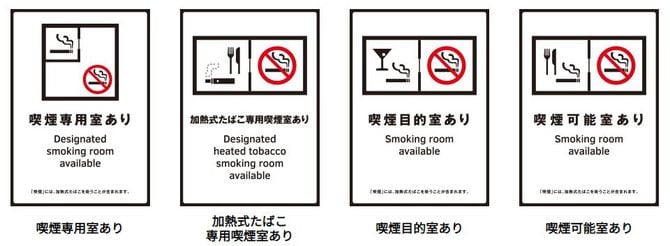 これらの喫煙ができる店舗は、店舗の主な出入り口に下図の標識を掲示することが義務付けられている。町中で探す際はこれを目印にするといい。