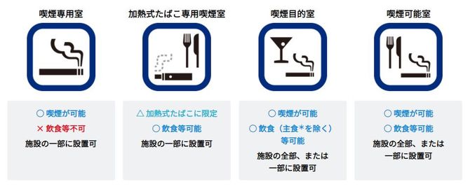 まず、最も大きなルールとなるのが「屋内は原則禁煙」というものだ。これは大規模な公共施設や商業施設だけでなく、レストランやカフェ、居酒屋などの飲食店にも適用される。ただし「原則」としているのは、ある条件や基準を満たした場合は例外が認められるためである。