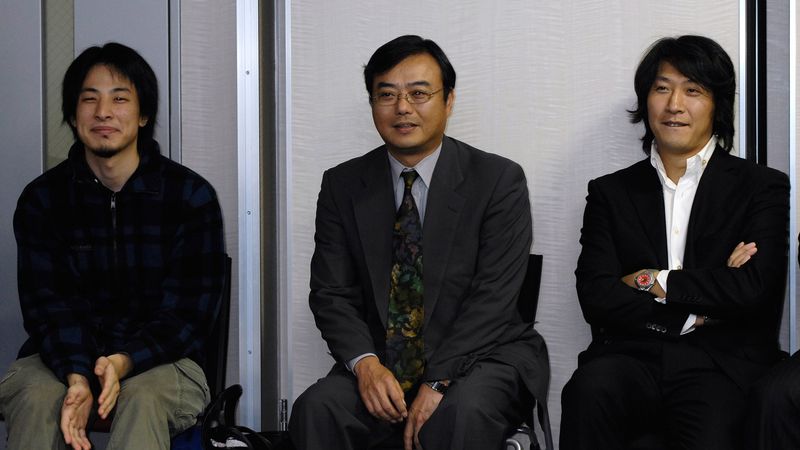 「ニコニコ動画(RC2)」発表会に出席した(左から)、2チャンネル創設者の西村博之氏、小林宏・株式会社ドワンゴ代表取締役社長、杉本誠司・同ニコニコ事業部長=2007年10月10日