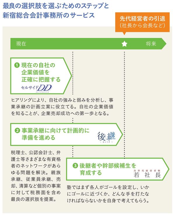 ひと言で事業承継といっても「親族内承継」「親族外承継」、そして「M&A」など、さまざまな選択肢がある。いざ事業承継の問題に直面したとき、どれを選べばよいか悩む経営者は多い。では最良の選択肢とは何か、新宿総合会計事務所グループの清水智明氏と藤本江里子氏に話を聞いた。