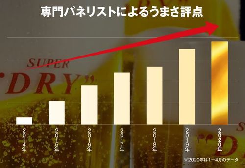 ビールのうまさの革新にも正面から向き合い進化を重ねてきた。「素材の良さを最大限に引き出す」「発酵力の高い優良酵母を厳選する」「酸化耐久性を向上させる」「醸造技術に磨きをかける」など、原料から製造のすべての工程で理想のうまさを追求し続け、2020年にはうまさの指標である「専門パネリスト(※)によるうまさ評点」で過去最高点を獲得。スーパードライ史上最高のうまさを実現している。