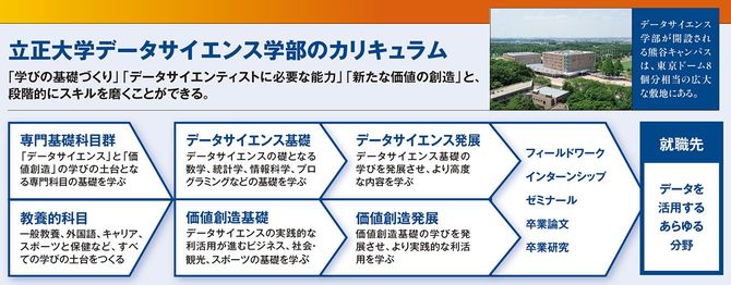 1580年に設立された日蓮宗の教育機関を淵源とする立正大学は、石橋湛山氏による経済学部の設置、また社会福祉学部や地球環境科学部の設置など、時代の要請に応えながら、8学部15学科を擁する総合大学へと発展。9番目の学部となるデータサイエンス学部の開設と同時に、全学的組織のデータサイエンスセンターも立ち上げ、学部を横断した教育支援・共同研究や学外との連携もスタートする予定だ。