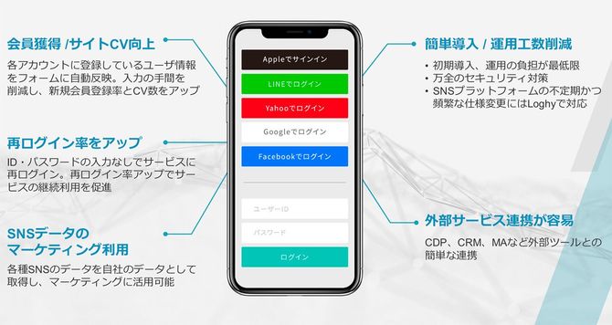 【久野】一つ目は、ソーシャル・ログイン・プラットフォーム「Loghy(ロギー)」です。ユーザがSNSのアカウントなどを利用して、各種Webサービスにログインできるようにするプラットフォームです。一般的なWebサービスでは、会員登録を行う際、ユーザが氏名や生年月日、メールアドレス、住所、電話番号などを入力し、IDとパスワードを設定しますが「Loghy」を導入することによって、そうしたユーザの手間が大きく軽減されます。
