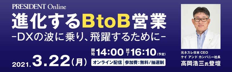 2021年3月22日(月)にPRESIDENT Online主催のオンラインセミナー「進化するBtoB営業-DXの波に乗り、飛躍するために-」を開催します。