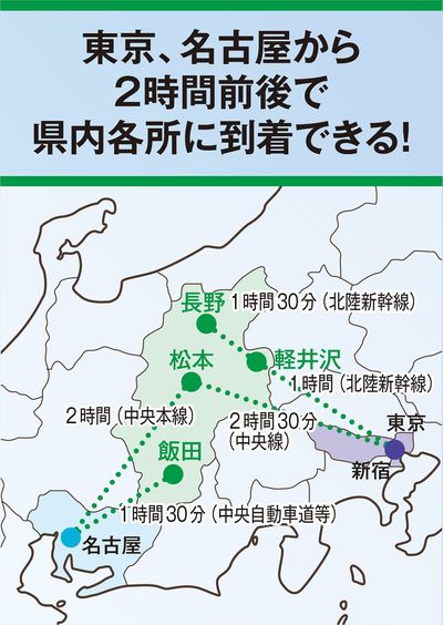 新幹線が通り、高速道路網も発達した長野県はアクセス抜群の身近なリゾート地です。スキー、温泉、森林セラピー、ワインなど、魅力的なコンテンツを数多く有し、「田舎暮らしの本」(宝島社)でも、「移住したい都道府県ランキング」で15年連続1位に選ばれています。高い技術力を持ったものづくり企業が集積し、近年はクリエイティブ企業の立地が進むなど、ビジネス環境も魅力です。