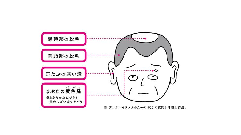 また、「コペンハーゲンシティハートスタディ」に参加した40歳以上の1万885人を対象として35年間追跡調査した結果では、見た目の老化サイン(前頭部または頭頂部の脱毛、耳たぶの溝、まぶたの黄色腫など)と心筋梗塞の発症率との間に有意な相関関係があることが明らかになりました。