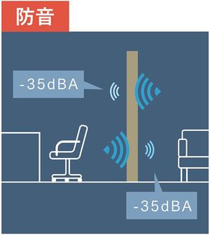 ※テレビの音(80dBA)が35dBA減音され、図書館と同等の静けさ(45dBA)になります。
