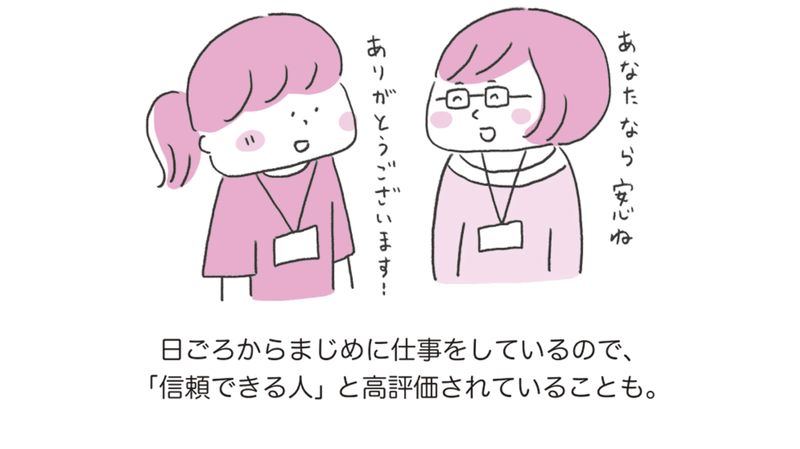 強い責任感をもち、誠実に仕事に向き合うHSPさんの姿勢は、じつは職場で高く評価されます。「○○さんに任せれば安心」と、周りから信頼をよせられ、まじめなHSPさんは、信頼を裏切らないようにとがんばって、さらに評価を高めます。