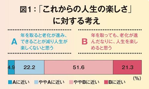 「私たちが昨年10月に実施した『高齢者ライフスタイル構造基本調査 2020年』の人生の楽しさに関する質問では、『年を取っても、老化が進んだなりに、人生を楽しめると思う』と考えている人が72.9%、『年を取ると老化が進み、できることが減り人生が楽しくないと思う』と考えている人が27.1%と前者が後者を大幅に上回っています(図1)。また、『積極的に老化予防をして、いつまでも若々しくありたい』と考える人の割合も3年前と比べて増えており、全体としてシニア層の前向きな姿勢が見て取れます」